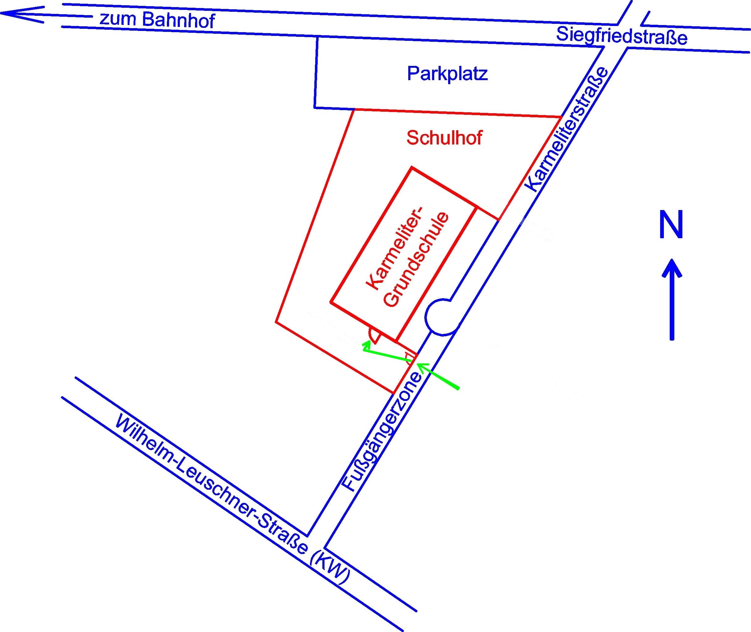 Benutzen Sie das Hoftor links der Schule. Die erste Tür des Schulgebäudes ist der Eingang zu den Räumen des Offenen Kanal Worms (RheinlOKal).